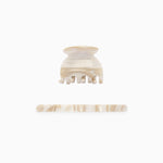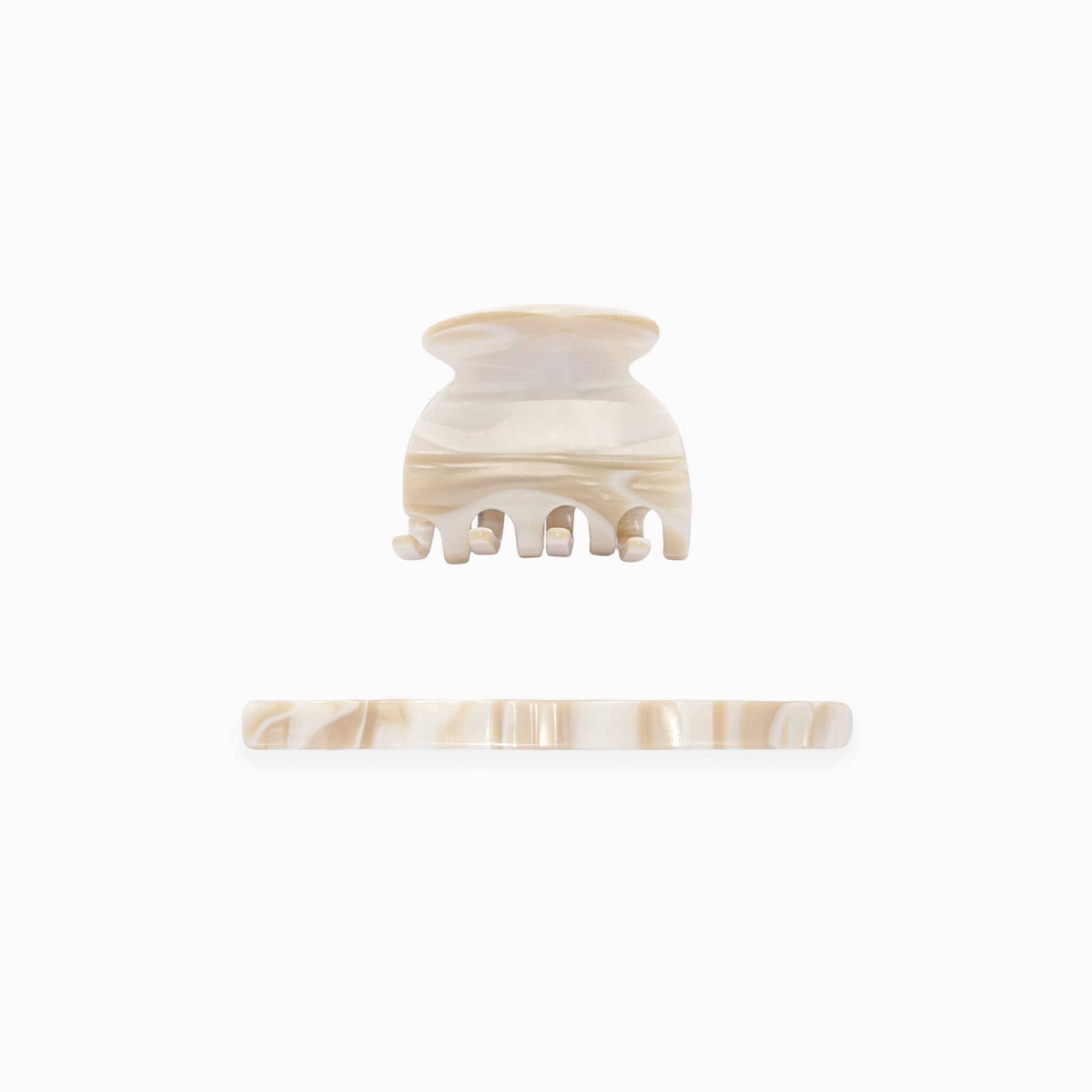 A curated set of the Form Clip & Minima Barrette in the shade Dune, with soft swirls of pearlescent ivory and beige.